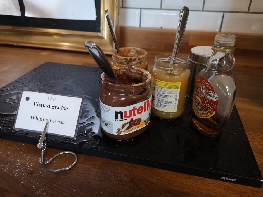 Även Gyllene Uttern erbjuder samma storlek på klenburk med NutellaFrukostserveringen på Örenäs Slott inkluderar en standard size burk Nutella att kladda med. Tyvärr utan pump...