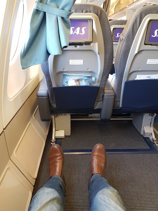 Det visar sig att på rad 30 så är faktiskt SAS udda fågel (som ofta benämns med sin registrering LN-RKP) att föredra. Benutrymmet är gigantiskt för att kort sammanfatta det. Flygvärdinnan som tog hand om det mesta runt omkring oss innan start var helt med på noterna att detta inte var ett plan vi ville åka med egentligen. Vi blev helt enkelt ombedda att SMSa de vi ville prata med de närmsta 7 timmarna då vi inte skulle ha WiFi ombord (små skämt låttar upp stämningen). På första raden delades även iPads ut med lite underhållning. Själv är dock bästa dräng som man brukar säga, reser man i Go på SAS longhaul så bör man ta med sin egen underhållning.