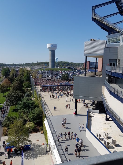 Vi tog en Uber ut mot Foxborough, en resa som ska ta ca 30 minuter. Vi åkte redan vid 09:30 för att vara där i tid. När man börjar närma sig arenan inser man dock att det är tusentals som kör tailgating med grillar, dieselaggregat, tält och flat screens TV på varenda liten parkeringsplats och de verkade ha varit igång ett tag. Vår chaufför hade onekligen inte varit här och det var strikta regler på att man inte bara fick hoppa ur så vi fick leta efter P15 där alla taxi skulle droppa folk. Tog lite drygt 1h innan vi hittade dit och kom ur taxin. Gick mot arenan och lagom till vi kom dit öppnade insläppet vid 11:00, 2h innan matchstart.