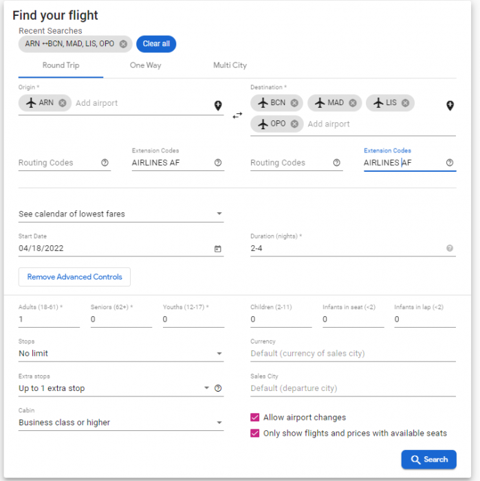 6. Om vill ha bra "bang för the buck" men inte resa tre segment, men nöjer sig med två så ser jag ofta destinationer som jag tittar på som BCN, MAD, LIS, OPO dyka upp med bra priser